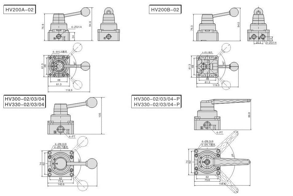 HV Series Hand Lever 4 Ports 3 Position Control Mechanical Valve Port size G1/4" G3/8" G1/2"