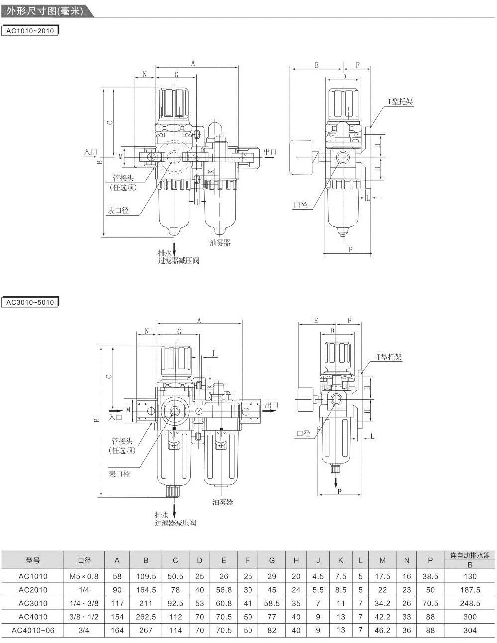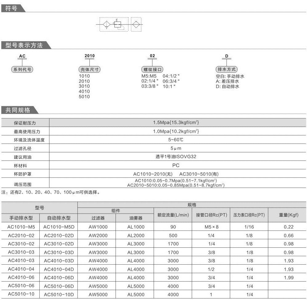 SMC型AC二联件自动排水空气过滤调压气源处理器AC2010-02 AC3010-03 AC4010-06 AC5010-10